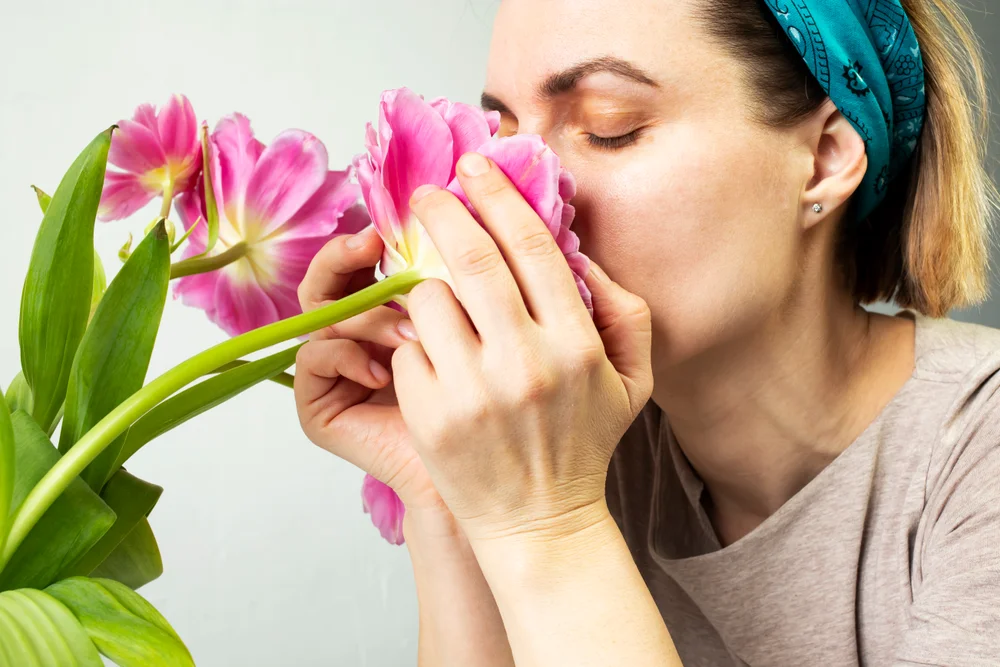 Take a slow breath and identify up to five smells in your environment. It could be coffee, flowers, fresh air, soap, or even paper. If your surroundings have little scent, you can use an essential oil or lotion.